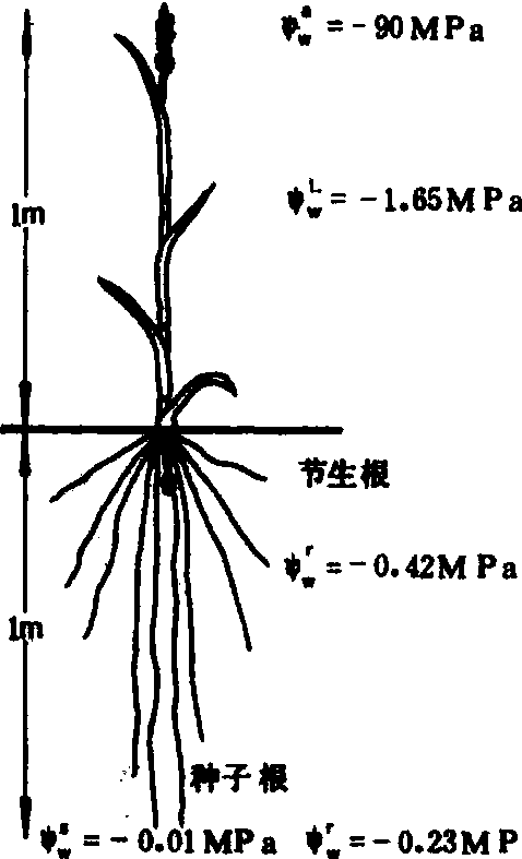 图中Ψsu为土壤水势;Ψru为根水势;ΨLw为叶水势;Ψau为大气水势。 植物水分胁迫时,水势相应降低,同时光合速率及生长亦受到抑制。特别是叶伸长最为敏感。例如,向日葵叶子的水势为-0.8兆帕时,其光合速率约为 30毫克/(小时·平方米)。水势从-0.8兆帕降低到-1.6兆帕时,光合速率相应降低至约15毫克/(小时·平方米);而叶伸长在水势从-0.2兆帕降至-0.3兆帕时几呈直线下降,到叶水势为-0.6兆帕时,叶伸长接近0。所以农业生产上应采取相应措施,防止水分胁迫,导致作物的水势明显降低,影响生长。 水势water potential物系中的水与同温纯水的化学势差。用以表示一物系中水的能量水平。水的移动能力决定于本身的化学势,水总是从化学势高处自发向化学势低处移动。水势是从水的化学势导出的,具有化学势的基本性质,即水也是从水势高处自发向水势低处移动,水势差同样可以说明物系间水分移动的方向、速率和限度。水势是根据平衡态热力学原理,用化学势来标志植物的水分状态。1941年,中国学者汤佩松和王竹溪著文分析细胞水分关系,提出了势能和化学势差的观点,是水势概念的最早倡导者,但未获得应有的重视和响应。目前的水势概念,是由斯泰坦尔和泰勒(R. O. Slatyer and S.A. Taylor) 1960年提出,后经克雷默等(P. J.Kramer)1966年修正而成的,其基本观点,并未超越二十年前汤、王二氏论文的内容。 水势同温下,体系中的水与纯水之间每单位体积水的自由能差。以符号ψw表示。其单位为巴,1巴=0.987标准大气压。纯水的自由能最大,水势最高。纯水的水势规定为零。当水中有溶质存在,使水势降低而成为负值。水分总是从高水势处流向低水势处。植物细胞的水势为:水势(ψw)=溶质势(ψs)+压力势(ψp)+衬质势(ψm);已形成液泡的细胞水势为:ψw=ψs+ψp;干燥的种子和分生组织的细胞水势则为ψw=ψm。通常,ψw≤0,ψs≤0,ψp≥0,ψm≤0,当细胞水势低于外界溶液水势时,水分便进入细胞,反之亦然。 水势water potential物系中每偏摩尔体积的水与同温度下纯水的化学势差,或同温度下物系中单位体积的水与纯水的自由能差。用希腊字“”表示,具有压力的量纲和单位。 化学势为每摩尔物质中可用于作功或发生反应的能量(J/mol);偏摩尔体积为物系中加入1 mol水后的体积增量(ml/mol)。通常由溶质势、压力势、衬质势和重力势组成。单位为MPa(兆帕)。标准状况下纯水的水势值最大,并规定为0,故植物体内的水势恒为负值。水势是水分运动或反应时表示能量状况的一种度量,是反映植物体内水分状况的最重要参数。不管是生物还是非生物体系,水分总是由高水势处流向低水势处。常用测定法有小液流法、压力室法和热电偶或露点湿度计法。 |