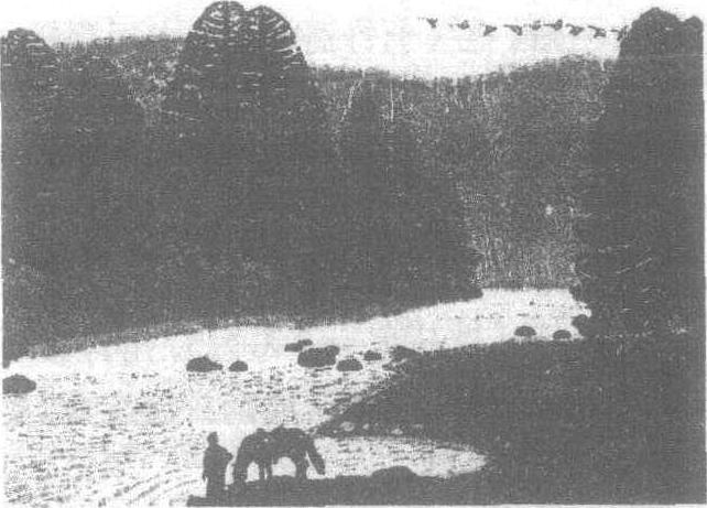 春归(水印) 张佩义 日本水印木刻源于中国,雕版水印技法通过佛经等书籍插图早已传入日本,特别是明代十竹斋版画和彩色套印技术对日本的套色水印版画产生了巨大的影响,直接推动了日本浮世绘版画的发展。日本现代水印木刻也是继承了传统的浮世绘版画,与现代创作版画结合发展而产生的,并形成了日本的水印木刻风格。日本水印采用干印法,印纸用厚而硬的版画纸或日本纸,用色用版较多,以色块表现为主,色彩较浓重强烈,因而缺少中国水印的清新滋润与水墨韵味,具有不同的艺术风貌。 |