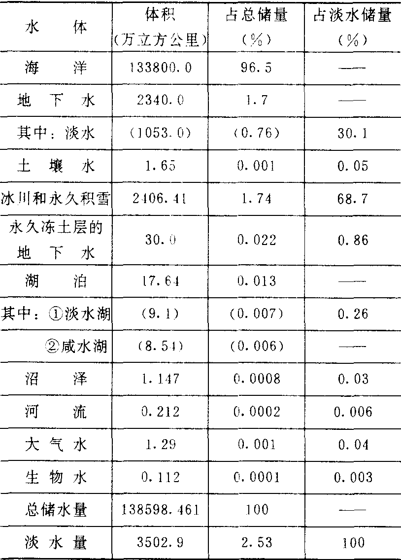 *据联合国会议有关文件,1977年。 水圈Shuiquan存在于地球上各种水体的总称。水在地球上的存在形式,大体分地面水、地下水、大气水和生物水四大部分。地面水主要包括海洋、湖泊、河流、沼泽、冰川等各种水体;地下水主要指储存在土壤和岩石空隙中的水;大气水是指悬浮于大气中的水蒸汽或固态、液态水;生物水主要指一切生物有机体内的水分。所有这些水形成一个环绕地球的巨大圈层。水圈和大气圈、生物圈、岩石圈中的水相互重叠、相互渗透。据估算,地球上水的总量为13.86亿立方公里,如均匀平铺在地球表面,平均水深为2,718米。海洋是水圈中一个连续的最大水体,总水量为13.38亿立方公里,占地球总水量的96.5%,平均深度为3 800米,如果把海洋水平铺在地球表面,平均水深可达2 624米。由于地球表面有70.8%被海水覆盖着,所以地球有“水的行星”之称。地球上全部河流、湖泊及沼泽的总水量约为19万立方公里,仅占地球上总水量的0.014%,这部分水与人类生活密切联系。大陆冰雪总水量为2 406万立方公里,约占地球总水量的1.74%,占地球上淡水总量的68.7%,为地球上储量最多的淡水资源,但难以开发利用。地下水总储量为2 340万立方公里,其中淡水为1 053万立方公里,占地球总水量的0.76%,占淡水总量的30.1%,也是人类利用淡水的主要来源之一。大气水总量约有12 900立方公里,占地球总水量的0.001%。生物水总量约有1120立方公里,约占地球总水量的0.0001%(表)。地球上淡水总储量只有3 502.9万立方公里,占全球总储量2.53%。而对人类生活最密切的河流、淡水湖水、浅层地下淡水仅有10.46万立方公里,仅占淡水总储量的0.34%。水资源虽然属于再生资源,但再生的数量仍是有限的,只有当对一个地区的水资源的开发利用量不超过它本身自然恢复量,是不会产生供需之间的矛盾。故水资源并不是取之不尽,用之不竭的,而是一种有限的自然资源。 表 全球水储量 (1km3=10亿m3)