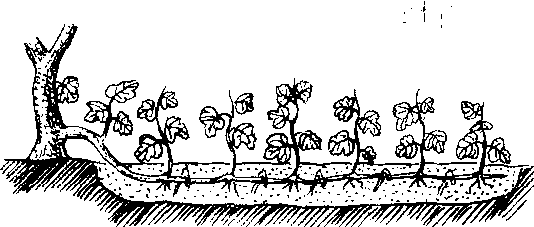 | 释义 | 水平压条continuous layering又称连续压条。压条繁殖方法之一。将要繁殖的枝条截去过长部分,春季时在树旁掘约5 cm浅沟,将枝条水平压入浅沟内,用枝杈固定,使生根和发梢,以后随着新梢的伸长加深覆土,及时抹去枝条基部强旺萌蘖,秋后剪离分植。靠近母株基部保留1~4根枝条,供来年再行水平压条之用。此法能使同一枝条上得到多数植株。葡萄、苹果矮化砧、紫藤、蔓越桔、蔓性蔷薇等常用此法繁殖。