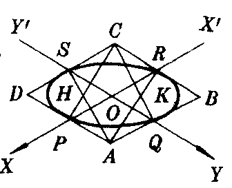 图2 由于上面的画法比较麻烦,所以实际上常采用下面的近似画法:❶如图3,作XX′轴,YY′轴成120°角. ❷在两轴上取OP=OR=OQ=OS=圆的半径. ❸过P,R分别作YY′轴的平行线,过Q,S分别作XX′轴的平行线,得菱形ABCD. ❹连结AS,CP交于H,连结AR,CQ交于K. ❺分别以H,K为圆心,HS为半径作 ![]() ,分别以A,C为圆心,AS为半径作![]() ,则四段弧就组成菱形ABCD的内接近似椭圆.