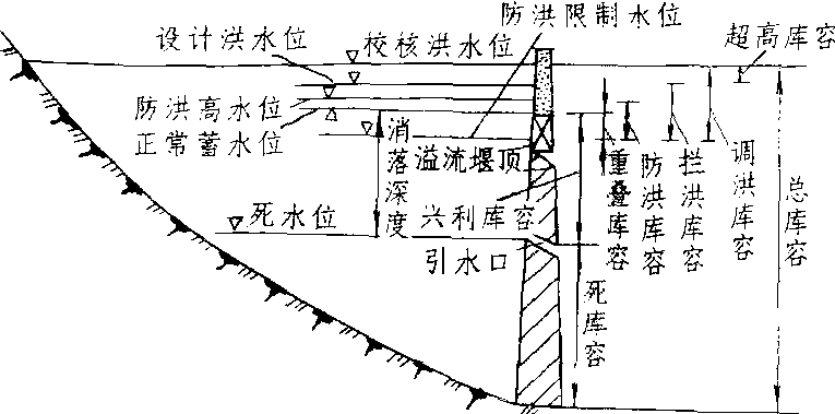 水库特征水位和相应库容示意图 水库Reservoir拦洪蓄水和调节水流的水利工程建筑物。在河流上或湖泊出口处修筑水坝而形成。水库的水可用于田园灌溉、市民饮水和工业用水,也可用于发电、建立娱乐设施、防洪和野生动物生态环境保护。通常根据3个基本的客观标准进行分类:最大深度、洪泛区和最大容水量。大型水库为特定目的而有不同的水位,以保证在一年的某一个时期水库内存有足够的水用于某一特定的目的,比如,夏季娱乐、灌溉或发电等。水库的选址必须进行仔细严格的科学论证,以决定在建成之后是否能满足设计需要,全面估计可能创造的效益。通常,研究工作以月份为单位进行,研究人员要根据50年~60年的水文和气象记录衡量水库在干旱或洪涝条件下可能发挥的作用。研究的结果将决定筹建中的水库在再度发生灾害时能否正常运行。为了在洪涝期间分洪排涝,水库都配有泄洪道。泄洪道通常被设计为有能力排泄当地可能发生的最大洪水。 水库水库是指用坝闸堤堰等筑成,用以蓄水并起径流调节作用的水体,又称人工湖泊。拦河筑坝形成的水库; 利用天然湖泊在其出口处筑坝和控制闸门则形成湖泊水库。中国规定,水库蓄水体积在10万立方米以上,小于10万立方米者为池塘。 中国水库等级