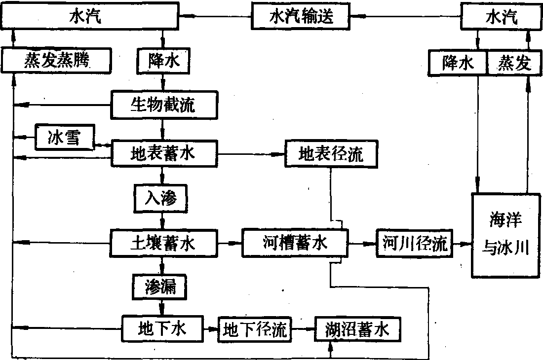 水循环系统由海洋、河流、水汽等多种形态水的贮存(库)亚系统,通过输入与输出的流彼此联结成动态循环。输入输出亚系统间水的交换、更新过程,包括水汽输送、降水、蒸发蒸腾、土壤水运动、径流等。它们是水循环中人类极为关心的重要因素,只有通过不断交换、更新才使水成为可更新资源并发挥积极作用; 降水与河川径流的意义、土壤水运动与地下水的意义日趋重要;水汽输送、降水和蒸发是决定气候状态的重要因素; 淡水只占全球水量的2.6%,蒸发蒸腾使咸水自然脱盐产生淡水,也使许多污染物与水分离。各种形态水的贮量及交换更新速度不同(表1),它使水