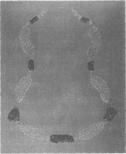 | 释义 | 水晶琥珀项饰辽。长40厘米 1974年辽宁省法库县叶茂台7号辽墓出土。辽宁省博物馆藏。整件项饰由258粒水晶珠和7枚琥珀佩饰制成。水晶珠有橄榄形、爪棱形等式样。琥珀佩饰中有五件雕作动物形,几股并拢的水晶珠串间缀一枚琥珀佩饰所组成的项饰,红白对比强烈,素雅大方,体现出工匠脱俗的审美情趣。