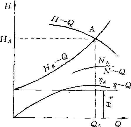 | 释义 | 水泵工作点pump operation point又称水泵工况点。水泵的流量一扬程关系曲线与需要扬程曲线的交点。如图中的A点,它表示水泵在一定装置条件下运行时,能够提供的实际流量(QA)、扬程(HA)、功率(NA)与效率(ηA)。A点随上、下游水位的变化而变动。通常所指的工况点是指水泵在设计工况下的工作点。在泵站设计和运行管理中,都应使水泵工作点位于水泵的高效率区。用这个原则指导机泵的选型配套和工况调节,就能获得较高的经济效益。