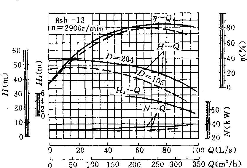 | 释义 | 水泵性能曲线pump characteristic curves又称水泵特性曲线。水泵性能参数随流量而变化的关系曲线。水泵在转速或叶片安装角度一定的条件下运转时,扬程(H)、功率(N)、效率(η)、允许吸上真空高度(Hs)或气蚀余量(△h)等工作参数随流量(Q)而变化的关系曲线。由于泵内水流流态复杂,各部分水力损失难以计算,只能借助试验的方法绘制。水泵样本中各种型号水泵的性能曲线是根据模型试验换算而得的。将水泵在不同转速或不同安装角度下运行时的一系列水泵性能曲线绘于同一张坐标图中,就得到水泵通用性能曲线。性能曲线全面反映了水泵的工作性能,用途很大,可以指导机、泵选型,正确地确定安装高程以及调节运行工况,使水泵能长期在高效率范围内运行,以节省动力。下图为8sh-13离心泵的性能曲线。