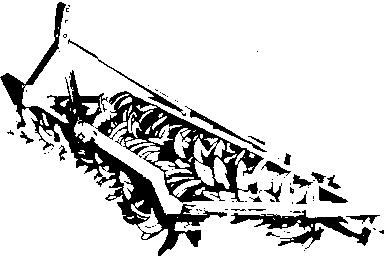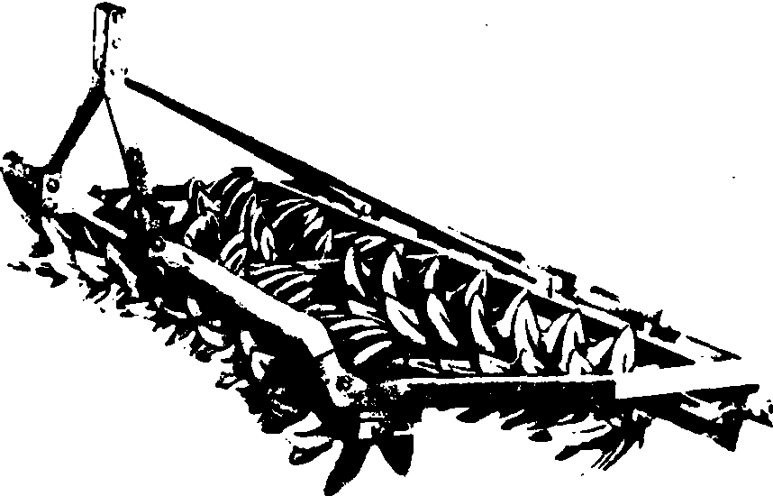 图2 轧滚 驱动型水田耙 原理和结构与旋耕机相似,只是将旋耕机的旋耕刀辊改为耙辊。常用刀齿式耙辊是将刀齿按一定规则焊接在板条上或叶片上成为齿板,然后将齿板固定在刀盘上,形成耙辊。其优点是适应性强,在各种土壤中均有良好的效果,缺点是能耗稍大,结构稍复杂。驱动型水田耙耙辊转速约220~250转/分。机组前进速度约为3~7千米/小时,一般插秧前细耙前进速度较慢,沤肥粗耙时前进速度较快。耙辊直径一般为320~400毫米。刀齿式耙滚的叶片一般为4块; 叶片常采用后倾安置,后倾角约26°~45°;在粘重土壤中为增加叶片入土能力,也采用不大于20°的前倾角安置。叶片宽度大致是耙辊半径的35~45%,叶片在耙辊上排列位置左右对称,刀齿形状有三角形、梯形、楔形和圆弧形等。刀齿刃口为曲线,故不易挂草。 在有的驱动型水田耙上,耙辊后面还带有一耥板,其功用是将耙过的田面耥平,以利于插秧。 水田耙paddy field harrow用于水田春夏季犁耕后碎土、平土、压草、起浆作业的整地机械。其工作部件由缺口圆盘耙组和轧滚或星形圆盘耙组与轧滚组合在一起,既可以加强碎土、压草和整平起浆的作用,又可减少耙田次数,降低作业成本。中国南方水田系列耙中有两列和三列等配置形式,为5种功率级中、小型拖拉机配套。