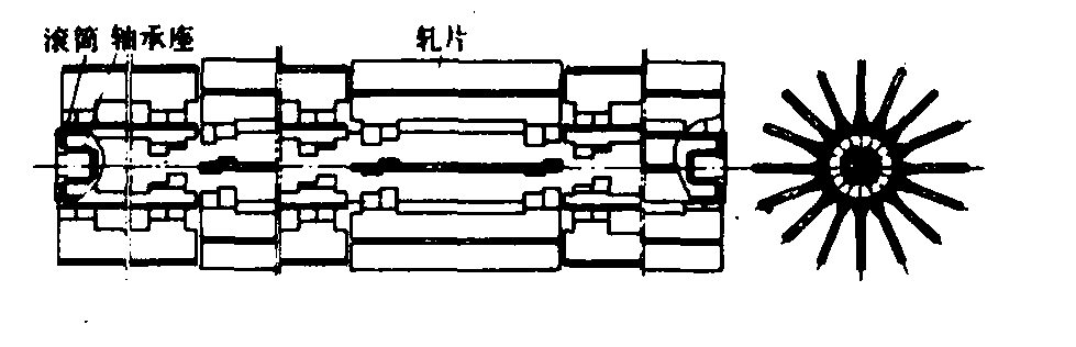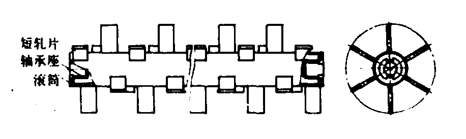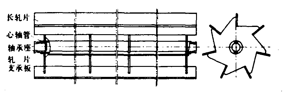 图1 三列水田耙 缺口圆盘耙组由若干个凹面缺口圆盘定距安装在一个轴上而成,切土翻土能力较强,起浆作用不如星形耙组,阻力亦较大,但在粘重土壤中有较好的切碎作用。圆盘直径约450毫米,曲率半径约600毫米。 轧滚是在中国南方传统农具蒲辊基础上发展的,主要起灭茬和起浆作用,亦具有一定的碎土、平地功能,有叶轮式、笼式和百叶桨式等(图2)。叶轮式轧滚是将轧片分段交错焊在滚筒上,叶片上留有缺口,利于泥水通过,防止粘泥和减少阻力,具有较好的灭茬性能,一般用在二列或三列耙上。笼式轧滚是将若干长轧片焊在垂直固定于心轴管的几块带缺口的支承板上,形成中空笼式结构的轧滚,结构简单,效果好,泥块不易壅塞,适用于土质较粘性的地区。百叶桨轧滚是将短轧片按螺旋线排列焊接在滚筒上,特点是不易夹泥粘土,造成堵塞,有一定的碎土起浆性能,适于粘重土壤。轧滚工作是靠滚动使轧片横向切入土壤或作用于稻茬将其压入土中。常用的轧滚直径,二列耙约为360毫米;三列耙约为280~320毫米。