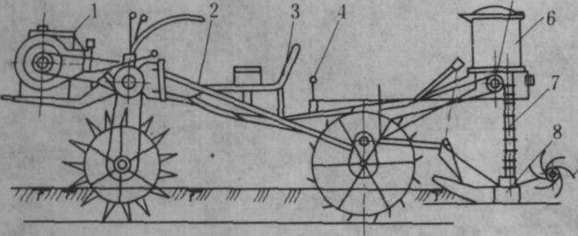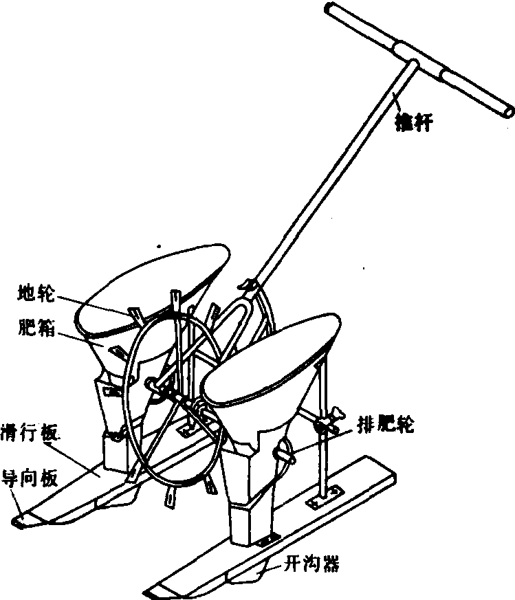 图1 人力双行水田粒肥深施机 机动水田施肥机主要由排肥器、输肥管、开沟器、覆泥板、传动部分和安全离合器等部分组成(图2)。