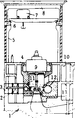 水电站厂房横剖面 1.基础底板 2. 水轮机阀门 3.侧墙 4. 发电机层楼板 5.构架柱 6. 吊车梁 7. 桥式起重机 8.屋顶大梁 9. 发电机 10. 尾水平台 11. 机墩 12. 蜗壳 13. 水轮机转轮 14. 尾水闸水槽 15.尾水管 |