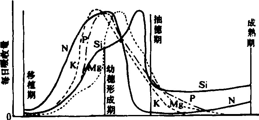 式中 M为某要素的移动率;x为叶片中某要素积累的最高量;y为该叶片枯萎时的某要素含量。 磷在稻株中移动性最大,约有4/5可从老叶转移到新叶;氮次之,为2/3;钾的移动性较弱,约为40%。所以,水稻在生长前期氮、磷供应充足,稻叶积累的氮、磷含量就高,当叶片衰老时,大部分养分转移到新器官中,因而后期就不易感到缺乏。钾在体内移动性比氮、磷弱,新器官获得的钾素较少,容易感到钾素不足,应注意钾的供应。 水稻抽穗以后,叶片中的元素有一部分运到谷粒中,但不同元素运转的数量差异很大。氮、磷运转率(指谷粒中养分量占谷粒及稻草养分总量的百分数)较高,约分别达75%和85%,钾的运转率较低,仅为25%左右,因而稻秆中含钾(K2O)量高。养分的运转率受灌浆期营养状况的影响。后期贪青时,氮肥运转率明显降低,仅为40%~50%。杂交稻氮、磷运转率比常规稻低,约分别为65%和70%,钾的运转率更低,只有15%左右,因此,应注意后期钾的供应。 氮、磷、钾对水稻产量的分期效应 分期效应是指某一个生育阶段中,水稻吸收的单位重量的养分(如氮、磷、钾)所能增加的稻谷产量。 氮对水稻产量的分期效应,常有两个峰值,一个是在分蘖期,主要是促进分蘖,增加有效穗;二是在幼穗分化期,主要是增加每穗粒数、结实率和千粒重。第二个峰值出现与否与土壤中氮素的丰缺有关。如果土壤中氮素丰富,一般不出现第二个峰值,说明此时无追氮的必要。反之,土壤氮素不足,此时供氮则有良好效果。 磷对水稻的分期效应只有一个最高值,即在移栽后2~4个星期,4个星期以后的效果明显下降。可见,水稻移栽后2~4个星期,尤其是第二个星期,是水稻需磷的关键时期。 钾对稻谷的分期效应在生育初期高,以后下降,抽穗前又略有回升。 土壤供肥能力 供肥量 水稻吸收的养分来自土壤与肥料两个方面。以氮而言,一般每公顷稻田土壤每一季可提供氮素50~110千克。不同土壤供氮量的差异受土壤肥力状况、水稻类型及气温高低的影响。据对水稻吸收土壤氮和肥料氮的测定,土壤提供的氮素可占吸收总量的50%~80%。地力贡献与产量呈密切相关,产量越高,地力贡献越大。当早稻每公顷产量为4050千克时,地力贡献约占35%;产量为6000千克时,地力贡献提高到60%;产量超过7500千克时,地力贡献高达85%。 土壤提供的磷、钾一般为吸收总量的55%~80%。 土壤供肥特性 稻田渍水后,随着淹水时间的延长,土壤中铵态氮和有效态磷、钾的含量增加,其增加量受土壤类型、气温及栽培措施的影响,因而形成了不同的供肥特点。在夏季高温多雨期间,土壤氮素的矿化速率达到最高,即稻田土壤氮素释放的高峰期约在8月到9月中旬之间,其次是6月中旬到7月。这种供氮规律大体能适应单季晚稻分蘖高峰和幼穗分化阶段大量吸肥的要求。但在栽培双季稻的条件下,要求土壤在6月上旬和8月中下旬形成两个比单季稻要求更高的供肥高峰,因此,土壤天然供肥过程与双稻稻吸肥峰值有较大差距。 土壤中有效磷,因渍水后的Eh值降低,使磷酸铁转变为磷酸亚铁。同时,淹水后pH值升高,可促进磷酸盐的水解作用及提高土壤中二氧化碳的分压,均可增加磷的有效性,尤其是含磷酸铁高的土壤,有效磷明显增加。中国南方水稻土含有大量磷酸铁,渍水后有效磷增加,且随着渍水时间的增加而增多。但以磷酸钙为主的土壤,淹水后有效磷增加很少。在双季稻生长前期,由于土壤淹水时期短、土温低,土壤中有效磷含量较低,容易出现缺磷症状;早稻生长后期和晚稻因土壤渍水时间长,磷的有效性提高,所以缺磷症状逐渐缓解乃至消失。 土壤溶液中钾的浓度因渍水而增加。其增加数值与可溶性铁、锰有关。可溶性铁、锰高,则置换出来的钾多。但应注意,渍水也会加速钾的流失。土壤缓效钾的释放速率对土壤速效钾的补充有重要影响。水稻吸收的钾约有35%~75%来自土壤缓效性钾。大部分土壤含缓效性钾在60%以上,而来自速效钾只占40%左右。所以,在评价稻田土壤供钾状况时,不仅要测定速效钾的含量,而且要重视对缓效钾的测定。 施肥技术 氮肥 在中高等肥力条件下,每公顷按6000~6750千克产量计,以施氮肥180~190千克为宜,其中有机肥约占40%。 氮肥在双季稻田主要采用如下两种不同的施肥方法:❶“前促、中控、后保”施肥法。双季稻的吸肥高峰期在移栽后2~3个星期,此时需从土壤中吸收较多的养分,然而土壤释放的养分不能满足前期生长的需要,必须在移栽前施用速效性肥料,才能使土壤供肥高峰提前,以适应双季稻“前促”的要求,通常把肥料的70%~80%集中于前期施用。当分蘖达到预期目标后,再采用搁田或烤田的方法,控制氮素吸收。稻田复水后,对叶色褪淡严重的稻株,于孕穗期施保花肥,以提高根系和叶片活力,减少颖花退化,提高结实率,增加千粒重。“前促、中控、后保”施肥法适用于本田生育期短的双季稻以及供氮能力低、阳离子代换量大的土壤。尤其在氮肥用量水平较高时此法更为适宜。 ❷“前稳、中攻、后补”施肥法。中国南方雨水多,在早稻生长期正值低温,肥料利用率低,“前促”的施肥方法,易使秧苗前期暴长,后期脱肥。因此,提出前期肥料应适当控制,而重点攻大穗。这种施肥方法着眼于栽培前期促根、控叶、壮秆。由于根系发达,活力强,就为穗分化期吸肥提供了基础。当穗进入分化期,于第一苞分化期至第一枝梗分化期重施促花肥,以增加颖花