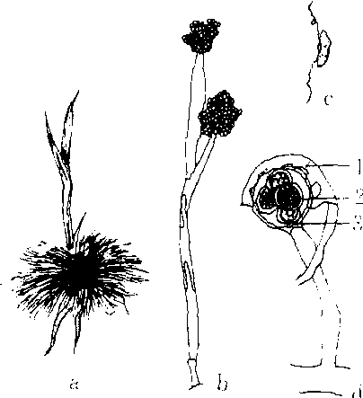 水稻烂秧症状 a.烂秧(水杨梅) b. 游动孢子囊 c. 游动孢子 d. 藏卵器与雄器结合 1.雄器 2. 卵球 3. 藏卵器 |