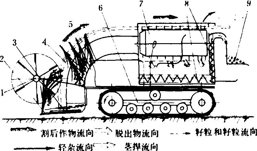 图2 卧式割台半喂入水稻联合收割机 1.拨禾轮; 2.切割器; 3.割台输送装置; 4.中间输送装置; 5.动力; 6.底盘行走装置; 7.弓齿脱粒装置;8.脱出物螺旋输送装置; 9.茎秆集堆装置 全喂入水稻联合收割机 按脱粒装置的不同分为轴流型和切流型两种。 全喂入轴流型水稻联合收割机 图3是配挂在中型轮式拖拉机上的轴流型水稻联合收割机,工作原理与谷物联合收割机相同。由分禾器、拨禾轮、切割器、割台螺旋输送器组成的收割台通过前支架悬装在拖拉机的前方。配置在拖拉机一侧的输送槽将收割的作物输送给悬装在后支架上的脱粒清选装置。脱出物由风机进行简易风选。由于采用了杆齿滚筒的轴流脱粒装置,脱粒和分离的时间长且柔和,可以省去传统型联合收割机上体积很大的逐稿器,并降低了籽粒破碎率。但因配置的是轮式拖拉机,在湿软田作业的通过性能较差。