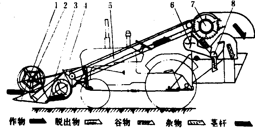 图3 全喂入轴流型水稻联合收割机 1.分禾器; 2.拨禾轮; 3.切割器; 4.割台螺旋输送器;5.输送槽; 6.风机; 7.脱粒滚筒; 8.籽粒螺旋输送器 全喂入切流型水稻联合收割机 由传统型谷物联合收割机改进发展而成,适于在大田块上作业。其特点有:❶脱粒装置多采用钉齿脱粒滚筒,或采用钉齿和纹杆式两个滚筒,提高了脱粒分离能力,减少了籽粒的破碎; ❷为提高凹板和逐稿器的分离能力,降低分离损失,在两个滚筒之间或逐稿器上方加装辅助分离装置; ❸采用超低压宽断面轮胎,四轮驱动,半履带或全履带行走装置,改善了湿田通过性能。 用途 欧美国家如美国、苏联、意大利等水稻种植面积不大,只占谷物种植面积的3%左右,人少地多,田块面积较大。水稻收获时田面较干,主要用全喂入水稻联合收割机,也可用以收获小麦为主的传统型谷物联合收割机更换脱粒装置后进行收获。这种机型的特点是工效较高,但存在着损失率和籽粒破碎率较高、机型大而重、对小块湿软水稻田适应性差等问题。大部分亚洲水稻生产国如中国和日本,水稻种植面积占粮食作物种植面积的比例很大,种植集中,田块面积小,收获时田面湿度较高,且部分地区还要求保持稻秆完整,以便于综合利用,故多采用半喂入水稻联合收割机。 水稻联合收割机ricecombine主要用于收获水稻,可一次完成收割、脱粒和清选的联合收割机。有全喂入式和半喂入式两类。水稻收获时,土壤中的含水量较高,机具容易下陷,因而水稻联合收割机都采用全履带或半履带行走装置。半喂入联合收割机多采用橡胶履带,全喂入联合收割机多采用金属履带。水稻联合收割机也可用来收获麦类作物。 水稻联合收割机以收获水稻为主的联合收割机。按脱粒方式分半喂入式和全喂入式2种。中国于1958年研制出第1台半喂入式联合收割机,20世纪70年代又研制出卧式割台半喂入式、立式割台半喂入式和船型半喂入式3类联合收割机。水稻联合收割机也可用于禾谷类作物收获。 |