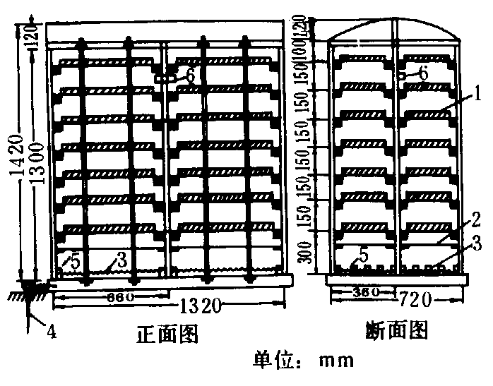 暖房式育秧器内部结构 1.秧盘;2.调热板;3.加温元件;4.接地棒;5.绝缘瓷柱;6.温度继电器 |
