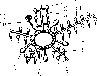 海盘车的水管系 1.坛 2. 足 3. 吸盘 4. 管足 5. 环管 6. 侧管 7. 辐管 8. 铁特孟氏体 9. 波里氏囊 10. 石管 11. 筛板 |