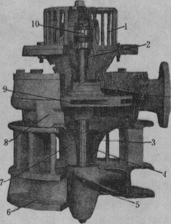 注:型号中10—转轮直径,6—每米水头能泵水的扬程(米)。 同型水轮泵可以串联使用以提高扬程,或并联使用以增加流量。 水轮泵water turbine pump靠水力驱动的提水机械。主要由水轮机和水泵组成(图),水轮机的转轮由水流驱动旋转,再由转轮驱动水泵叶轮,进行提水作业。
