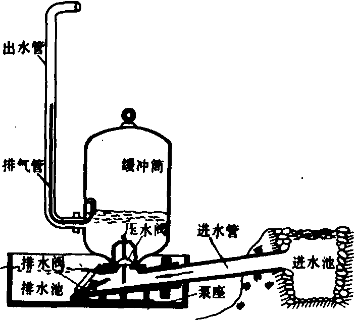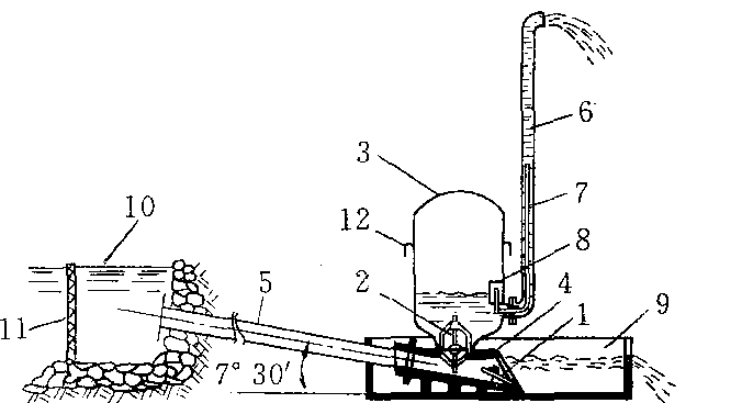 水锤泵 1. 冲击阀 2.进水阀 3. 空气室 4.机座 5.进水管 6. 出水管 7.放气细管 8.排气罩 9.排水池 10. 进水池 11. 滤栅 12. 吊钩 |