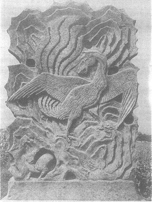 | 释义 | 永厚陵瑞禽浮雕北宋治平四年(公元1067年)。通高251厘米,宽166厘米。河南省巩县宋英宗赵曙永厚陵的神道石像生。瑞禽马首,龙颈,鹏翅,鸟身,凤尾,鹰爪。浮雕在高约4米,宽约2米的石壁上。其双翅大展,屹立于高山云雾间,回首俯视下界,六片凤尾高扬,张嘴作高歌状。瑞禽足下的岩洞中,一小兽似应瑞禽召唤,探身洞外,仰首观望着,一副小心谨慎,惴惴不安的样子,形象颇为可爱。