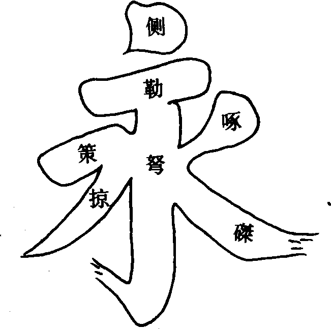 永字八法 永字八法以 “永” 字八种笔划来阐述楷书用笔的一种方法。来源说法不一。其法称点为“侧”,须侧锋峻落,铺毫行笔,末尾从中间出锋; 横划为 “勒”,须逆锋落笔,缓去急回,不应顺锋平过,宜中间略高; 竖笔为 “努”,用力之意,行笔不宜太直,太直则无力,故须直中出屈势; 钩为“超” (即挑笔),钩末要挫锋提笔,其力集中笔尖,笔不挫则意不深; 仰横为“策”,用力在发笔,得力在划末; 长撇为“掠”,宜用力送笔,使劲匀称,一送到底,不可半途撇出,致使飘浮无力; 短撇为 “啄”,下笔驻锋即出,锐且速; 捺笔为 “磔”,要逆锋轻落笔,平铺笔锋,至末收锋,重在含蓄。后人对善于书法的人,称为 “研精八法”,“八法” 两字引申为书法的代称。 永字八法以“永”字八种笔画来阐述楷书用笔的一种方法。来源说法不一。其法称点为“侧”,须侧锋峻落,铺毫行笔,末尾从中间出锋;横划为“勒”,须逆锋落笔,缓去急回,不应顺锋平过,宜中间略高;竖笔为“努”,用力之意,行笔不宜太直,太直则无力,故须直中出曲势;钩为“超”(即挑笔),钩末要挫锋提笔,其力集中笔尖,笔不挫则意不深;仰横为“策”,用力在发笔,得力在画末; 长撇为“掠”,宜用力送笔,使劲匀称,一送到底,不可半途撇出,致使飘浮无力; 短撇为“啄”,下笔驻锋即出,锐且速; 捺笔为“磔”,要逆锋轻落笔,平铺笔锋,至末收锋,重在含蓄。后人对善于书法的人,称为“研精八法”,“八法”两字引申为书法的代称。 |