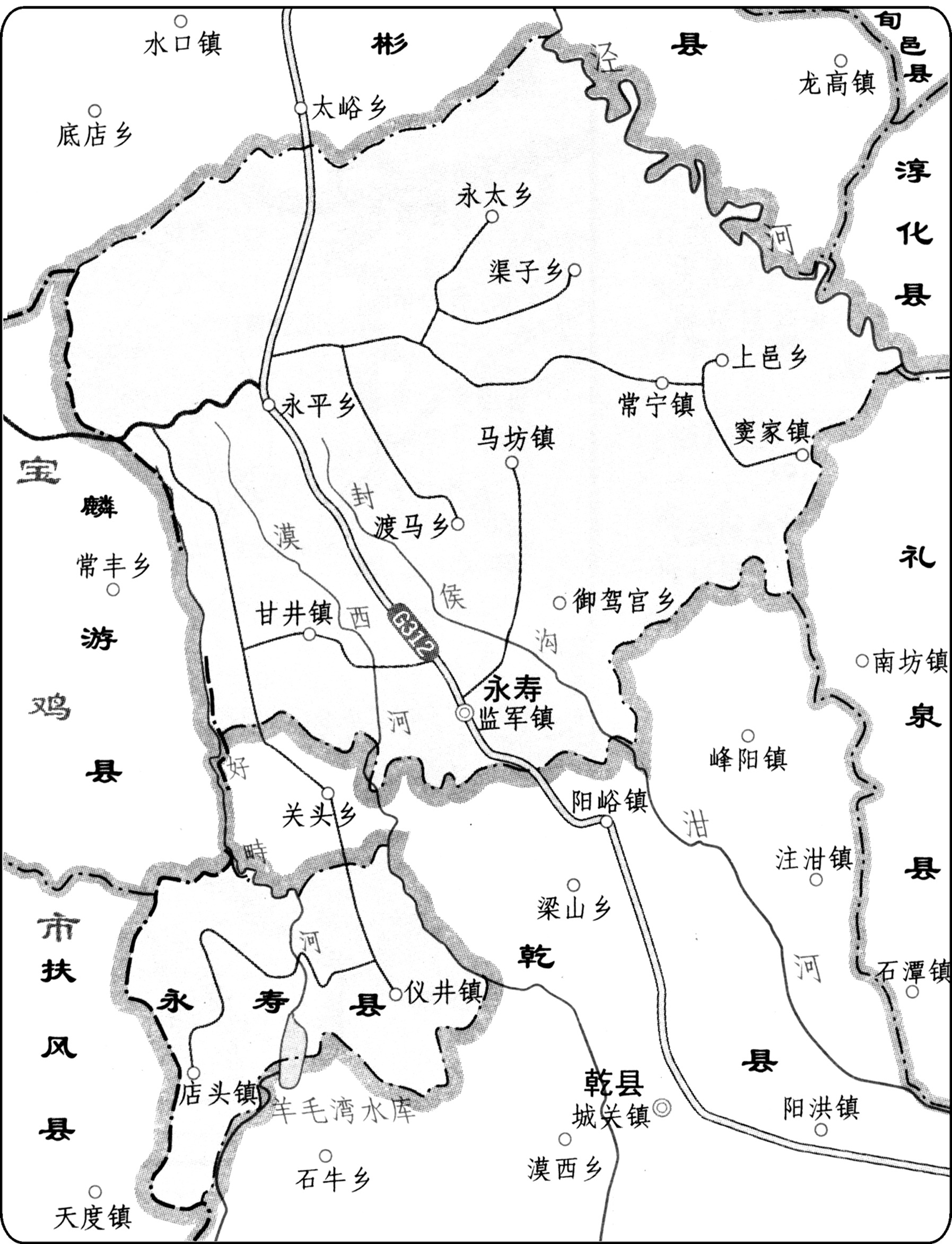 咸阳市辖县。位于咸阳市西北部,东至淳化、礼泉,南到乾县,西连麟游,北接彬县。县政府驻监军镇。面积889平方公里,其中耕地面积49.53万亩。地处黄土台原与陕北高原的过渡地带,属黄土高原丘陵沟壑区,地势北高南低,海拔572~1505米。全境分为四大地形区:北部低山丘陵沟壑区,中部残原沟壑区,东北部丘陵沟壑区,南部破碎原区。主要山峰有娄敬山、五峰山、黑山、永寿梁和六十里梁。其中永寿梁最大,由北部向南部和东南部倾斜,是泾、渭两流域的分水岭。沟占全县总面积的45%。主要沟有8条,集水面积占全县99%以上。主要河流有泾河、漆水河、漠西河、三岔河,河网密度为1.47公里/平方公里,径流总量6551万立方米。其中泾河最大,沿县境东北边缘自西北向东南流入礼泉县,过境流程48公里,流域面积365.4平方公里,年均流量68立方米/秒,河道比降1.99%,落差95米。漆水河、漠西河次之,境内流程各为30.7和30.6公里,平均流量漆水河为1.77立方米/秒。气候属暖温带大陆性季风气候,冬长而寒冷,夏短而温和,四季分明,日照充足。年平均气温10.8℃,年日照2166.2小时,无霜期约210天。年平均降水量601毫米,7~9月降水量占全年的52%左右。全县常住人口16.55万,其中非农业人口1万余人。境内居民以汉族为主,占总人口的99%以上,还有少量回、彝、满、蒙等少数民族。辖监军、常宁、店头3镇和仪井、甘井、永平、平遥、底角沟、永太、渠子、马坊、渡马、上邑、窦家、御驾宫、蒿店、郭村14个乡。其中仪井乡和店头镇被扶风、麟游、乾县三县包围,隔成“飞地”。