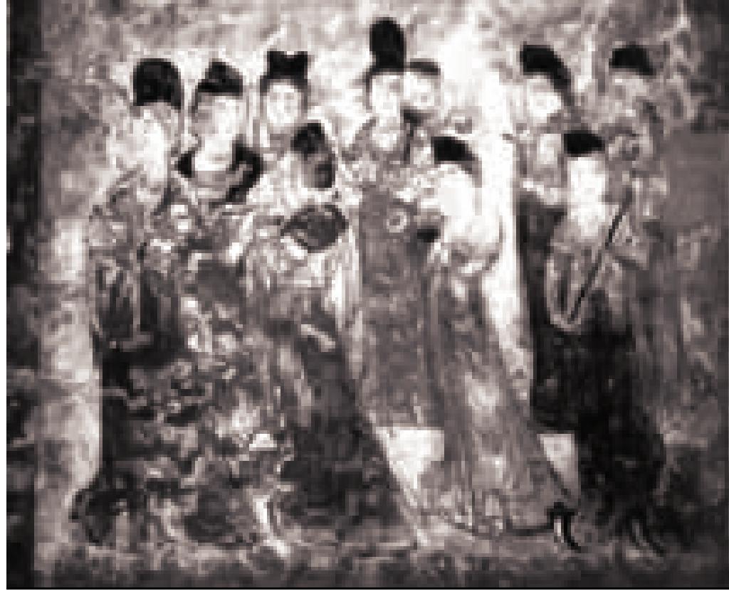 | 释义 | 永泰公主墓壁画宫女图yongtaigongzhu mu bihua gongnütu1960年乾县乾陵公社(今城关镇)唐永泰公主李仙蕙墓出土。4幅。一幅绘于墓内前室东壁南部,高179厘米,宽210厘米,绘有宫女7人,共9人,头梳高髻、螺髻、双螺髻。身穿窄袖袒胸襦衫,肩披帛巾,下穿红、绿、黄色曳地长裙,裙下露如意云头履尖。分别手持烛台、团扇、如意、方盒、盆、高足杯等物,侧身缓行。一幅绘于墓内前室东壁北部,高179厘米,宽210厘米,绘有宫女7人,5人分别着红、黄、绿色曳地长裙,肩披长巾,梳单髻、螺髻、双螺髻、高髻,2人着男装,其中1人戴黑色幞头,穿黄色翻领长袍,1人着圆领长袍,下穿波斯条纹裤。宫女分别手持蜡烛、杯、方盒、包裹、团扇等,缓步向前。一幅绘于墓内西壁南部,绘有宫女9人。为首一人头梳高髻,着白襦绿裙,披红色披巾,双手挽巾抱于胸前。最后一人头戴黑幞头,着圆领红袍,穿波斯条纹裤,作男装。中间七人分别梳单髻、双髻,着窄袖襦衫,穿黄、红、绿色曳地长裙,肩披长巾,手捧杯、盘、漆奁、拂尘等生活用品,跟随为首一人缓步前行。一幅绘于墓内北壁西部,绘宫女2人。为首一人头梳高髻,着白襦红裙,裙下露云形履头,双手挽披巾抱于胸前。后者梳双螺髻,着窄袖襦衫,穿绿色曳地长裙,双手抱一漆奁,紧随其后。此四幅宫女图生动地反映了当时豪华的宫廷生活。墓主葬于大足元年(701)。现藏陕西历史博物馆。