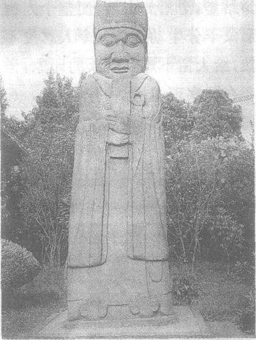 五代前蜀光天元年(公元918年)。高318厘米。四川省成都市西郊王建永陵石像生。文官头戴介帻,身着盆领宽袖大袍,足蹬云头靴。缩头耸肩,双手执笏于胸前。其阔头方面,铃眼丰腮,嘴微裂,惊诧中流露着悲哀,形象虽显得有些呆板,但勾勒简单,表情生动,与陵墓的肃穆气氛相协调。