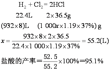 例1 某合成盐酸的工厂平均每小时烧掉氢气和氯气各1000L(20℃,1.01×105Pa),每班8h生产出37%的盐酸(密度为1.19g·mL-1)52.5L,试计算盐酸的产率。 解 氢气和氯气在标准状况下的体积: