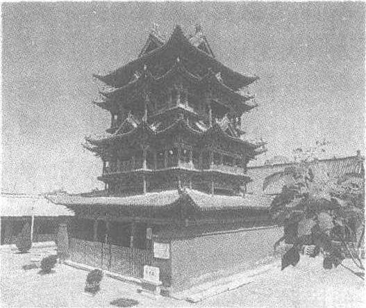 | 释义 | 东岳庙飞云楼创始年代不详,唐时已有楼,清乾隆十一年重建。位于山西省万荣县解店镇东岳庙内。高约40米。楼平面呈方形,三层四檐,十字歇山式楼顶,中央四根通天柱直达顶层。底层面阔、进深各五间。二、三层皆有勾栏。每面各出抱厦一间并做出小开间,上筑屋顶,因此从飞云楼的每面都可看到三个歇山顶和四层屋檐。构成极为丰富的轮廓线。各层檐角起翘。最为引人注目的是此楼结构中的斗拱部分。斗拱转角甚多,形体壮丽,结构精细,华丽多姿,与檐头32个翼角交相呼应,为我国楼阁式建筑的杰作。