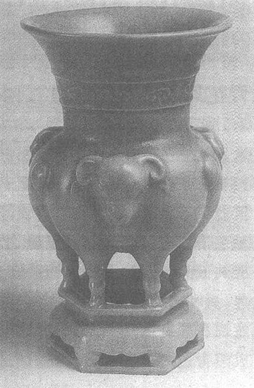 | 释义 | 汝窑天青釉窑变米色三羊瓷尊宋。高20.4厘米,口径12.5厘米。台北故宫博物院藏。侈口,喇叭形颈,腹部由三羊组成,羊首写实,羊身写意。六羊足踏于六边形镂空器座之上。颈部饰云纹一周。施天青窑变釉,开细片纹,颈部有桔眼。棱角釉薄处显露黄胎。器底未施釉,六角各有支钉痕一枚。宋代五大名窑中汝窑传世品最少,此件造型奇特的瓷尊是其中的一件珍品。汝窑见“‘寿成殿皇后阁’汝窑青釉瓷盘”条目。