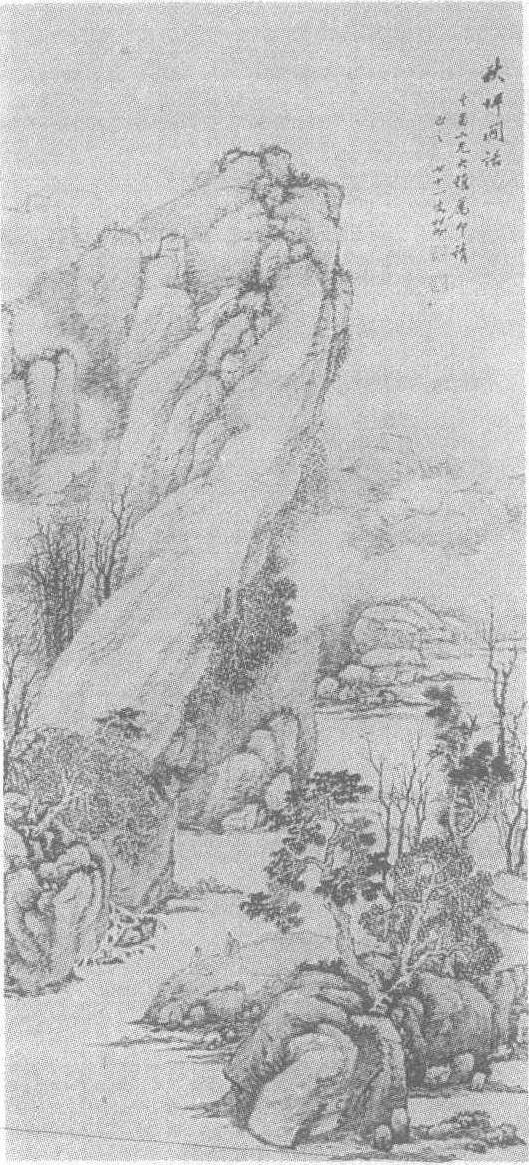 | 释义 | 汤贻汾秋坪闲话图轴清。汤贻汾绘。纸本设色。纵97厘米,横46厘米。北京故宫博物院藏。汤贻汾(公元1778—1853年),字若仪,号雨生,晚号粥翁,武进(今江苏常州)人,寓金陵(今南京)。书画诗文名重当时,与戴熙并称“汤戴”。咸丰癸丑(1853年)年间,太平军攻克南京,投水而死,谥贞愍。通天文、地理和百家之学,能琴、棋、剑、箫诸艺。书画取法董其昌,善作山水、花木,其墨梅韵致疏秀、老笔纷披;写苍松古柏,纵横恣肆、颇能入古;花卉学恽寿平,简淡有情,而稍嫌细碎。有《琴隐园诗集》。他曾把笪重光的论画名著《画筌》分目编排成《画筌析览》十卷,流传很广。此幅写山野秋景。山石耸立,山崖上有红叶古树,岩坳间庙宇隐现。近景坡地之上闲士对坐共语,意态闲适。款识“秋坪闲话,今甫二见大雅属即清正之,七十一叟贻訜。”钤〈龙山琴隐〉、 〈忠孝子孙〉二印。幅右下有“虚斋审定”、“莱臣心赏”二方收藏印。