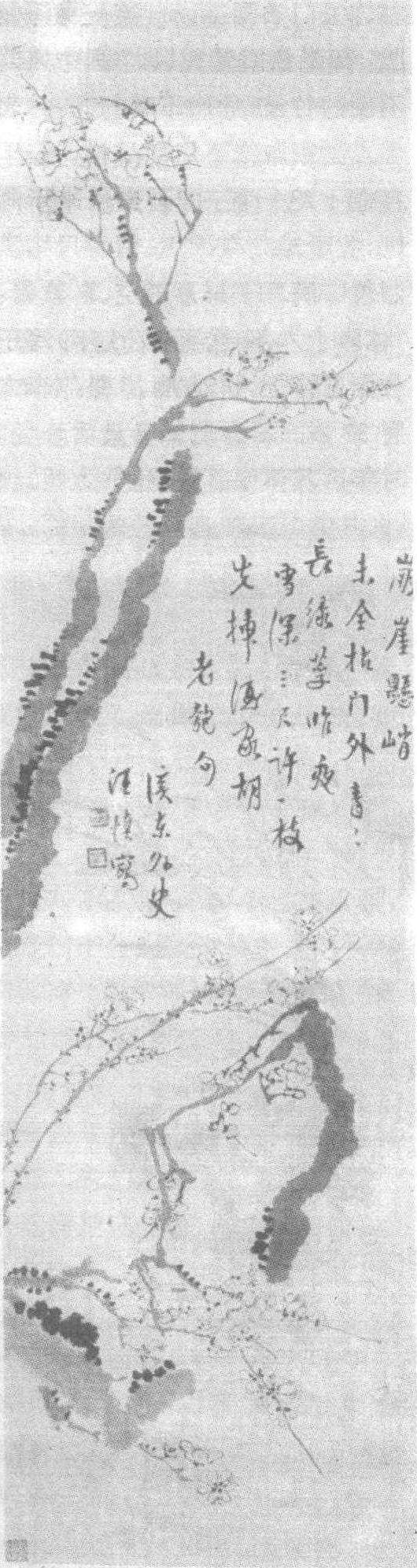 | 释义 | 汪士慎风雪梅花图轴清。汪士慎(见《汪士慎梅花图册》条目)绘。纸本墨笔。纵115厘米,横31.5厘米。江苏省扬州博物馆藏。汪士慎性爱梅,与金农、高翔、罗聘并称四大画梅高手。此幅梅花长幅,疏枝横斜,冰花点点,以淡墨润干,浓墨点苔,墨笔圈花。笔墨简约,疏朗清瘦,给人一种雅逸潇洒,冷香四溢的感觉。在画面中部,花枝之间,题以朱老匏诗句,字体细劲洒逸,诗书画交相辉映,充满“管领冷香”的意味,为汪氏精品。款题:“崩崖悬峭未全枯,门外青青长绿莩。昨夜雪深三尺许,一株先插酒家胡。老匏句。溪东外史,汪士慎写”。