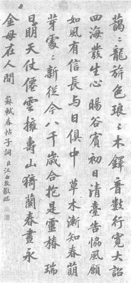 | 释义 | 汪由敦行书临苏轼春帖子词轴清。纸本。纵115.2厘米,横59.8厘米。清官旧藏,现藏北京故宫博物院。汪由敦(清康熙三十一年—清乾隆二十三年,即公元1692—1758年),字师茗,号谨堂、松泉。安徽休宁人。雍正二年(公元1724年)进士。官至吏部尚书,协办大学士。书法力追晋、唐,兼工篆、隶。汪氏在内廷供职数十年,办理公文迅捷干练,其文章典重有体,为高宗所赏。书法亦步“馆阁体”之列,并成为重要书家之一。清人李玉棻评其书“笔法秀润,神情逼肖,非仅皮相耳。”此件作品,行书临苏轼《春帖子词》,圆润雍容,疏朗平和,为“馆阁体”佳作,清逸挺健之处深得晋唐遗意。《石渠宝笈》著录。“馆阁体”,书体名称。明、清科举要求考生的字乌黑、光洁、方正。清代中期,要求更为严格,使书法艺术趋于僵化。明代称这种书体为“台阁体”,清代称之为“馆阁体”。后来贬称拘谨、刻板的字为“馆阁体”。