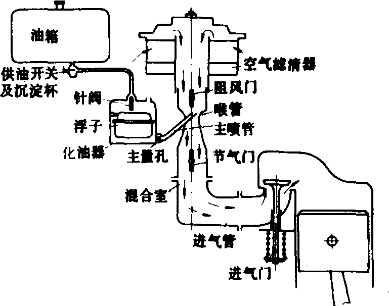 汽油机(小型)供油系统 油箱一般安装在发动机顶上,汽油靠重力进入化油器,以保证一定的供油压力。供油开关和带有滤网的沉淀杯一起装在油箱下部,沉淀杯及滤网使汽油保持干净,不致堵塞油路。化油器是汽油机供油系统中最关键的部件,它按汽油机各种工况的需要,供给适量的汽油,将其雾化后与一定比例的空气混合成均匀的可燃混合气。化油器按使用特点分浮子室式和泵膜式两种,多数机具采用浮子室式化油器,而使用过程中受强烈振动的机具则应用泵膜式化油器。 浮子室式化油器的工作原理如图。进气道上部有阻风门,上面与空气滤清器相联,中部有一呈喇叭形的喉管,下部为混合室,与进气管连接,内有节气门(俗称油门)。汽油靠重力进入化油器浮子室,室内有随油面升降的浮子,其上装有针阀。控制进油孔开闭,使浮子室内油面始终保持一定的高度。浮子室通过主量孔及化油器体上通道与主喷管相接,主量孔用来控制汽油流量大小,主喷管的出口正好在喉管的最狭窄处,其高度要比浮子室油面高出1—3毫米,以防止汽油机倾斜时汽油流出。当汽油机运转到进气行程时,空气从空气滤清器吸入,流经喉管的最狭窄处时形成低压,将汽油从浮子室经主量孔、主喷管的喷口吸出,并吹散成油雾。油雾在混合室和进气管中不断地汽化并与空气混合成均匀的可燃混合气,进入气缸进行燃烧,节气门用来控制进入气缸混合气量的多少,由机手操作。 |