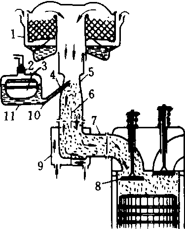 简单汽化器及可燃混合气形成原理 1. 空气滤清器 2. 针阀 3. 浮子 4. 喷管 5. 喉管 6. 节气门 7. 进气管 8. 进气门 9. 进气预热装置 10. 量孔 11.浮子室 |