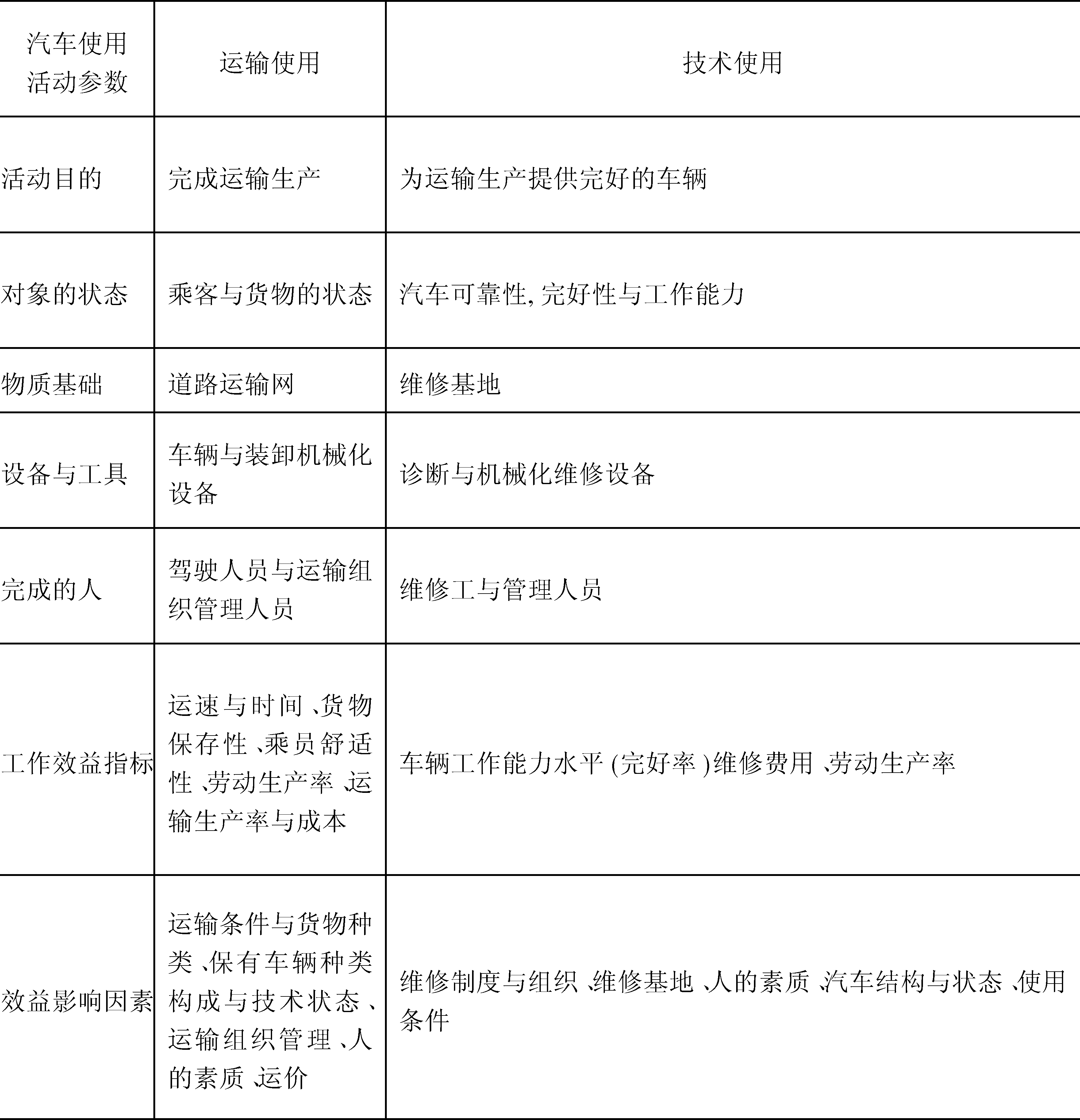 汽车运输使用和技术使用两类活动的总体。运输使用和技术使用活动的目的、活动对象、状态、物质基础、采用的设备与工具、组织管理机制、完成活动的人、工作效益指标及其影响因素均有不同的特点,见下表。
