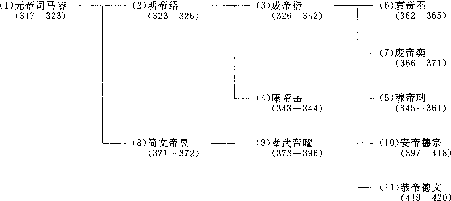 东晋317—420年朝代名 西晋建兴四年(316) 晋愍帝被汉匈奴军所俘,次年,琅邪王、扬州都督司马睿在建康 (今南京) 称晋王。又次年,愍帝被杀消息传来,司马睿正式称帝,是为晋元帝,都建康,史称东晋。其疆域大致在江淮以南,曾攻入关中,占领长安、洛阳和黄河以南地区。东晋王朝是依靠门阀士族的支持建立的,门阀王导及其从兄王敦一内一外,分掌文武大权。司马睿登基时,竟请王导同登御座受百官朝拜,虽王导固辞,而民谚云: “王与马,共天下” ( 《晋书·王敦传》)。东晋初,元帝试图加强皇权。削弱王氏势力,王敦立即从荆州兴兵,以清君侧为名,在王导和另一些士族支援下攻入建康,逼死元帝。此后,这种主弱臣强的状况始终没有改变,门阀士族居于支配地位,军政大权先后由琅邪王氏、颍川庾氏、谯国桓氏、陈郡谢氏等执掌。统治集团内部矛盾错综复杂,皇室与士族之间、南北士族之间、北方士族之间、门阀士族与低级士族之间的争斗不断发生。王敦两次举兵,其后又发生苏峻、祖约之乱。苏、祖攻破建康,纵兵放火焚烧,抢掠国库中的金银财帛,攻略义兴、晋陵各地,所过之地皆成废墟。这些叛乱虽终被平定,但严重破坏了江南经济,加深了人民的苦难。内争牵制了东晋的北伐。祖逖北伐因内争功败垂成,庾亮、庾翼经营北伐遭到反对。东晋中期,桓温攻取巴蜀,消灭成汉,但其北伐受到朝臣掣肘,而他本人也把北伐作为揽权的手段,故亦无所成。东晋门阀士族较之西晋更有优厚特权,他们凭借门第,自可平步青云,位至公卿。当时中央和地方的文武要职基本上都被士族垄断,尤其集中在王、谢、庾、桓、周、陆、顾七大家族他们兼并土地,封固山泽,荫占佃客,役使奴僮王朝规定一、二品官可占佃客40户,以下每品递减5户,至九品可占5户,但非法私占者则大大多出此数。如谢混“田业十余处,僮仆千人” ( 《宋书·谢弘微传》)。谢灵运 “因文祖之资,生业甚厚。奴僮既众,义故门生数百” ( 《宋书·谢灵运传》)。由于朝廷征调频繁和地主豪强残酷剥削,终于激起了孙恩、卢循领导的农民起义,但最后被刘裕镇压下去。刘裕出身低级士族,是东晋精锐之师北府兵将领。元兴二年 (403),桓温子桓玄篡晋,建国号楚。刘裕联合北府中下级军官起兵,击败桓玄,迎晋安帝复位,遂掌握东晋大权。义熙五年 (409),出兵北伐南燕,次年灭南燕,收复青、兖地区。镇压卢循起义后,又西灭成都割据势力谯纵,北上攻取长安,消灭后秦,终于在元熙二年 (420) 代晋称帝,东晋王朝至此灭亡。 东晋Dongjin朝代名。西晋政权被刘曜推翻后,琅玡王、扬州都督司马睿在南北地主士族的拥戴下于317年在建康(今江苏南京)即帝位,是为晋元帝,重建晋政权,史称东晋。东晋疆域北至汉水、淮河南岸,南抵今越南横山,东南至海,西至今四川大雪山。东晋时期,为了躲避十六国的战乱,大批北方人民南迁,据统计,到达长江流域的南迁者至少有70万人。他们被称作侨民,东晋政府设立了许多与侨人旧土同名的侨州、侨郡、侨县,使他们编入国家的户籍。东晋政府还对这些侨民实行经济优复政策,这对于招徕北方流民,使他们与农业生产相结合是有促进作用的。北方人民的大量南移,有力地开发了南方的经济。东晋是依靠门阀士族的支持建立起来的政权,因此门阀士族具有优厚的政治、经济特权,从中央到地方的要职都由士族垄断,他们又广占土地山林,荫占佃客,对人民实行残酷的剥削压迫,加深了社会矛盾。东晋统治阶级内部皇权与士族、士族与士族间的矛盾也是错综复杂,不断爆发内战,如王敦就两次举兵,后又有苏峻、祖约之乱。这些叛乱严重地破坏了江南的经济,加重了人民的苦难,同时也牵制了北伐的进行,使祖逖、桓温的北伐都没有成功。东晋后期,士族地主阶级的势力更加膨胀,无止境地兼并土地,加上朝廷征调频繁,巧取豪夺,阶级矛盾日益激化。爆发了孙恩、卢循领导的农民起义。这次起义虽然被镇压下去,但东晋的统治更加衰弱。另一方面,在镇压起义的过程中,东晋大将刘裕趁机发展实力。终于在元熙二年(420),废晋恭帝司马德文,自立为帝,改国号为宋,东晋灭亡。东晋共历11帝,统治104年。 东晋帝系表