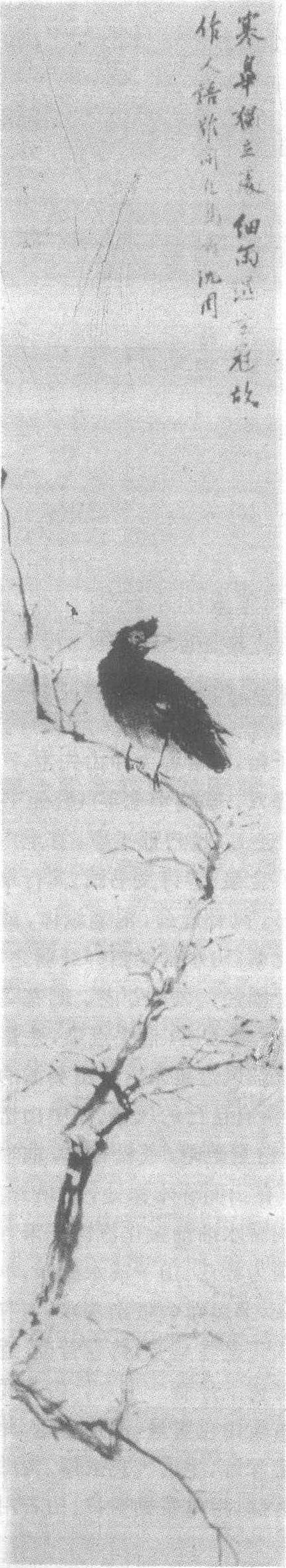 | 释义 | 沈周枯树八哥图轴明。沈周(见《沈周庐山高图轴》条目)绘。纸本水墨。纵152厘米,横27.4厘米。江苏省扬州博物馆藏。此图绘一只八哥在枯树枝上凝神站立。构图疏简,笔墨苍秀潮润。八哥身上的羽毛,全用水墨点染,笔墨润泽,用笔简洁而神态具备,形象生动、逼真。枯树苍劲硬挺,雄劲有力,质朴浑厚。右上自题:“寒皋独立处,细雨湿玄冠,故故作人语,难同凡鸟看。沈周。”诗、画相互辉映,互相应衬,恰到好处,相得益彰。钤白文<石田>、朱文<启南>二印。