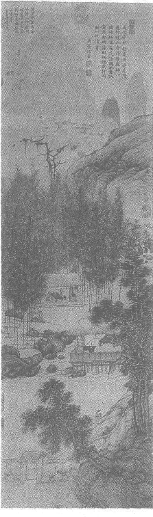 | 释义 | 沈贞竹炉山房图轴明。沈贞绘。纸本设色。纵115.5厘米,横35厘米。辽宁省博物馆藏。沈贞(公元1400年—?)又名贞吉,字南斋,号陶然道人,又号陶庵。长洲(今江苏苏州)人,工唐律及古文辞,善绘事,时谓埙篪相映。赋一诗,营一幛,必累月阅岁乃出,不可以货取,故尤以少见重。山水师法董源、杜琼,并有黄公望之风范。成化十八年(公元1482年),年82,尚为沈周题《秋林曳杖图》,卒年不详。此图绘清丽幽寂的溪山秀色。图中青峰远倚,峦冈近逼,溪泉湍涌奔流,坡岸宽平绵展。竹林深密,杂树茂郁。小径依山傍水,草墙逶迤伸延。一座明敞的水榭矗立溪中,竹荫山房之内,僧俗二人一面品酒,一面闲谈。此图笔法工细,设色明丽,山石皴染疏密有致,颇有质感。竹叶勾描繁而不滞,一丝不苟。风格清新,典雅秀逸。自识:“成化辛卯初夏,余游毗陵,过竹炉山房,得普照师□酌竹林深处,谈话间出素纸索画,余时薄醉,挑灯戏作此图以供清赏。南斋沈贞。”下钤〈沈贞之印〉、〈沈氏贞吉〉二印。成化辛卯为公元1471年,画家时年七十有二。此图为其晚年的精心之作,亦可从中探寻到吴门画派的源流。