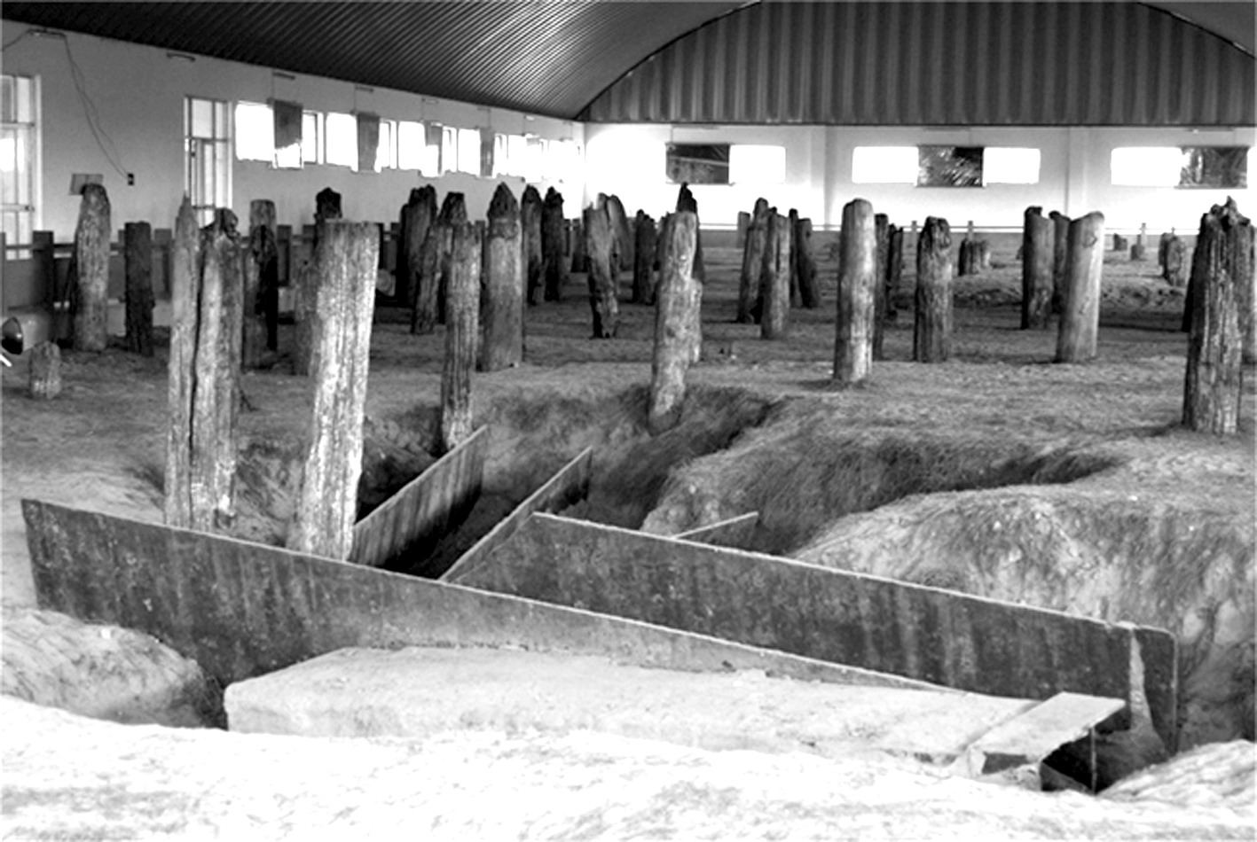 | 释义 | 沙河古桥遗址shahe guqiao yizhi位于咸阳市秦都区钓台镇西屯和资村交界的沙河古河道,东北距市区约8公里,北离渭河约2.5公里。1986年陕西省考古研究所发掘了两座桥梁遗迹,属秦汉文化遗存。两桥相距330米,均为木质结构。1号桥木桩排列整齐,清理出16排143根桥桩。2号桥清理5排40根桥桩,东西排列,南北对应。均为单桩。木桩表皮有明显裂痕,上端参差不齐,形状各异,有砍砸陈迹,另有一些似有榫卯结构。桥桩表面涂过一层油质保护物,並用火烤过。木桩直径0.34米~0.48米,间距2.10米~3.20米。木质主要有柏、松、柳、漆、梨、槐木。1号桥桥墩间距6米~6.7米,附近出土有变形葵纹瓦当、素面瓦当,几何纹砖,绳纹板瓦、筒瓦等。云纹瓦当与汉长安城等地同类文物的陶色、制法和风格均相同。其西南13.5米处出土一件大型铜饰件,外形呈叶状,长116,宽43,厚3.3厘米,重32.5公斤,两面均铸有花纹,一面是简化虁纹,另一面是三角几何纹,时代属战国晚期,系桥自身的附属物。2号桥附近出土遗物有板瓦、铜甑、铜熨斗、铜鱼、斧、戈及陶罐、铺地砖等。沙河古桥是秦都咸阳、汉长安城去上林苑西入巴蜀而跨渡沣水的桥梁,应属古沣水桥。1号桥建于战国末期,毁于秦亡。2号桥建于西汉初,毁于西汉末期。或认为沙河古桥即西渭桥,1号桥建于汉魏,2号桥建于隋唐,废弃于宋太宗至道二年(996)。