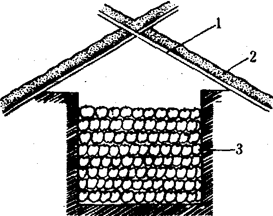 图 1 普通沟藏横剖面示意 改良沟藏 将沟址从露天包果场移至背荫处 (如农户院中南墙荫下); 沟为东西向,沟的宽度以背荫处的成荫宽度和包装容器的规格为依据, 一般沟宽应比遮荫宽度窄40~50厘米,并为包装容器横径的倍数,深度为其高度的倍数。沟盖改成开关的活动草盖或草苫,其遮盖面积大于沟口面积, 而宽度略小于背荫处的最小遮荫宽度,草盖厚度需大于10厘米(图2)。在入贮果采收前7~10天将地沟挖好,并作好沟盖, 白天盖于沟上, 晚上打开, 利用夜间的低温, 使地沟预冷, 待地沟内的温度达到与当地当时的夜间最低温度相近的准稳态时, 选择晴天的早晨, 开始采果入贮。采果需在早晨8:00~10:00以前,此时, 一天中果温处于最低状态, 采后立即封入厚0.07毫米塑料薄膜袋内。短小沟可一次装满, 长沟可分3~5次贮满。在整个入贮过程中,沟盖应照常开关, 直到进入封冻季节, 沟温达-2℃时, 停止开盖,并尽可能密封贮藏沟,到第2年温度回升至15℃时结束贮藏。改良地沟由于充分利用了夜间低温, 获取了比传统地沟显著的降温效应。可扩大应用于中熟苹果的中期贮藏。