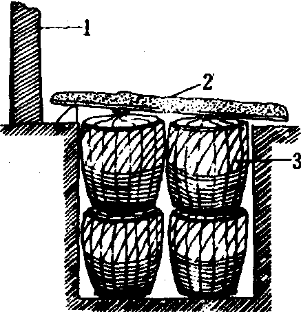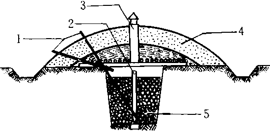 沟藏示意图 1.温度计 2. 通气管 3. 通气筒 4.顶盖 5. 沟 |
