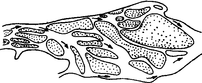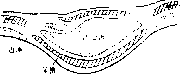 | 释义 | 河床hechuang指河流输水、输沙的槽形凹地。在山区,当洪水位时,河水有时占据谷底到达坡麓,而枯水时,河水只占据谷底中最低洼的部分。山区河床狭窄,河底多砾石,两岸常有山嘴突出,呈犬牙交错状。从河床纵剖面分析,常以深槽与浅滩交错出现,当遇到坚硬岩层或断层时,往往有跌水或瀑布形成。在河流中、下游平原区,河床宽浅,除河床外还有河漫滩和阶地。平原区因水流和泥沙作用,使河床不断发生变化。根据河床平面形态及其演化规律,将河床划分为顺直微弯、弯曲、分汊及游荡型四种类型。❶顺直微弯型河床 (图1): 在中、小型河流中可见到。其主要特征是河道较平直。在平水位时,水道呈和缓弯曲状,而从纵剖面看是浅滩与深槽交互出现,两侧边滩呈犬牙交错排列。当洪水到来时,河水顺河道直流而下,淹没了河底微地貌形态并使边滩向下移动。洪水过后,河水又恢复弯曲水道。