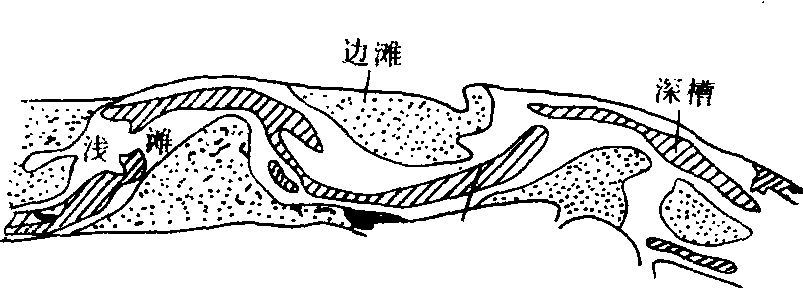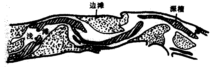 图5 游荡型河床的平面形态 河床Hechuang河流流水的线性槽地。是河流平时或洪水季节占据和通过的地方,而不是整个河谷的范围。河水携带着泥沙不断地在河床中流动着,侵蚀、搬运和堆积同时进行,不停地塑造和改变河床的形态。河流在沿着河床的纵剖面方向不断地向下切割,当它下切到接近某一水平面以后,逐渐失去下切能力,不能侵蚀到这个水平面以下,这个水平面被称为河流侵蚀基准面。这个侵蚀基准面最终受到海平面的控制,一般说来,河流的侵蚀基准面不能低于它入海口处的海平面高度。所以海平面的变化将导致一条河流的侵蚀基准面变化,侵蚀基准面降低将引起河流从河口向上游对河床的侵蚀加强,海平面抬高则将引起河流的堆积作用加强。一条河流上游段总是高于下游段的河床,所以河流对河床的侵蚀作用总是从下游向上游逐渐加强。另外在河流的某一段中如果地壳下降或上升也会引起局部侵蚀基准面的变化。局部侵蚀基准面的下降也会导致河流该段以上侵蚀作用的加强。这种河流沿侵蚀基准面向源地侵蚀的现象称为溯源侵蚀。溯源侵蚀不断地改变河床纵方向上的形态。如果海平面稳定不变,河流经过地段的地壳稳定不变,气候条件稳定不变,河流水量稳定不变,那么河流下切河床到一定深度就不再下切了、使河床中的堆积与侵蚀达到相对平衡、使河床纵剖面达到平衡状态,称为河床均衡剖面。事实上这种平衡是暂时的,不平衡是经常的,因为地壳在不停地运动,海平面也经常在变化,气候条件更是多变,河流水量也在不断变化,这一切决定了河床是在不断地变化之中。