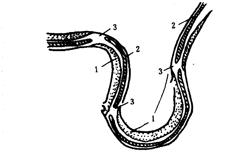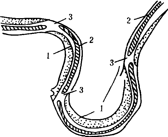 图2 弯曲型河床的平面形态 1.边滩;2.深槽; 3.过渡段浅滩