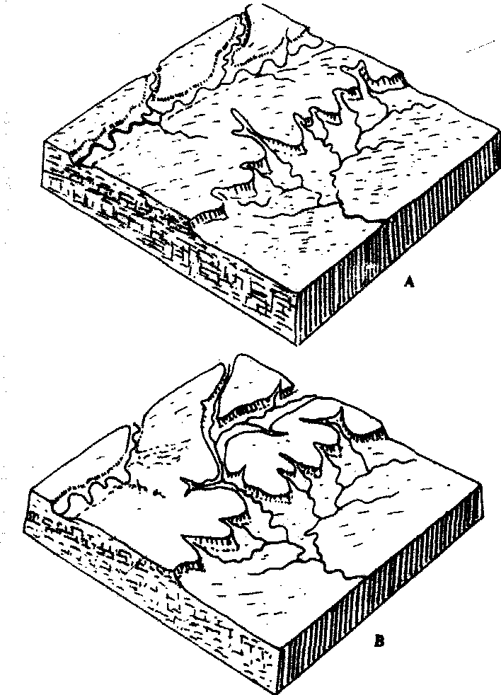 河流袭夺 A. 袭夺前的河流; B.袭夺后的河流 |