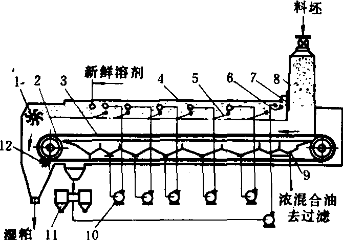 图1 典型油料浸出工艺流程 浸出器 按溶剂与料坯接触方式分为浸泡型、渗滤型与混合型;按结构外形分为罐组式、螺旋式、刮板拖链式、履带式、平转型、篮框式(水平或固定式)以及塔盘式等;按生产过程又有间歇式与连续式之分。 罐组式浸出器 为间歇式浸泡型浸出器,由3~8个结构相同的浸出罐组合而成。浸出罐由筒体、搅拌器、假底(栅底)、进料与出粕口、接管以及传动装置等组成。罐组浸出时,每只罐均按:装料、浸泡浸出(2~3次)、下压(走油)、上蒸(脱溶剂)、出粕等程序周期性地依次完成操作。该设备结构简单,适于处理小批量特种油料以及碎肉、油渣下脚、药用油脂(蓖麻籽渣)等。但处理量小、操作劳动强度大、不安全。 刮板拖链式浸出器 因其形状与环形刮板输送机相似而得名。国际上称为“皇冠”型浸出器。浸出时,料坯在截面为矩形的封闭壳体内,由拖链带动,环行一周即完成进料(预浸出)、浸泡喷淋—渗滤沥干浸出、洗涤、沥干与出粕的全过程。该机型特点是:料层薄、动态浸泡渗滤相结合,浸出效率高;结构简单便于运输;能适应多种油料浸出,处理能力范围较大(1~4 000吨/日)。 履带式浸出器 为渗滤型连续式浸出器。料坯在网状链上缓慢水平移动,从一端到另一端,即完成进料、喷淋浸出、洗涤、沥干与出粕的全过程。它配有5~9台混合油循环泵,将渗透到各集油斗的混合油顺次逆向喷淋浸出(图2)。还配有控制料位的闸板、耙松器、清洗毛刷、集油槽与过滤器等。履带速度在4.5~5米/小时范围内可调。特点是:浸出效率较高,混合油清净、卸粕连续,但是浸出时间较长,喷头多而易混流,设备利用率较低(仅占工作体积的25%)、维修不便。