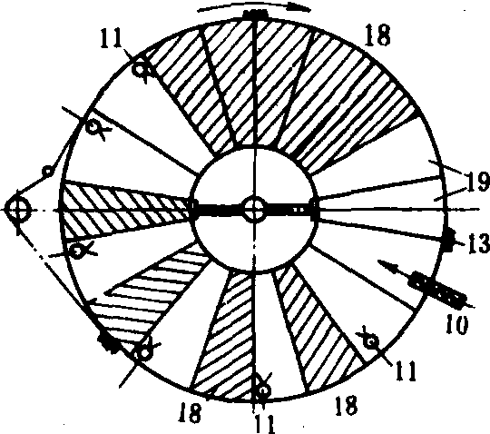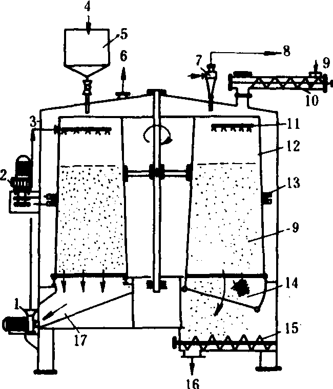 图2 履带式浸出器工作原理 1.拨料辊; 2.主(从)动轮; 3.履带; 4.壳体; 5.耙松器; 6.混合油喷头(翻斗); 7.闸板; 8.进料装置; 9.集油斗; 10.混合油泵(5~9台); 11.冲洗液过滤器;12.毛刷 平转型浸出器 应用最广泛的连续式混合型浸出器。其结构如图3。在圆筒形全封闭壳体内设有绕中心轴旋转的转筒,且分成若干(12~24)扇形浸出格,每一格下部装有筛网及筛板的假底,使形成存料空间,框格的转动由外圈2~3组链齿与二级摆线针轮减速器带动。当框格沿着支承在下部的内、外导轨回转一周时,即可连续地完成进料、喷淋浸出、新鲜溶剂洗涤、沥干以及最后假底下落卸粕的浸出全过程。每一浸出级均按“喷淋、渗透、沥干”进行循环,直至达到预定残油率指标为止。
