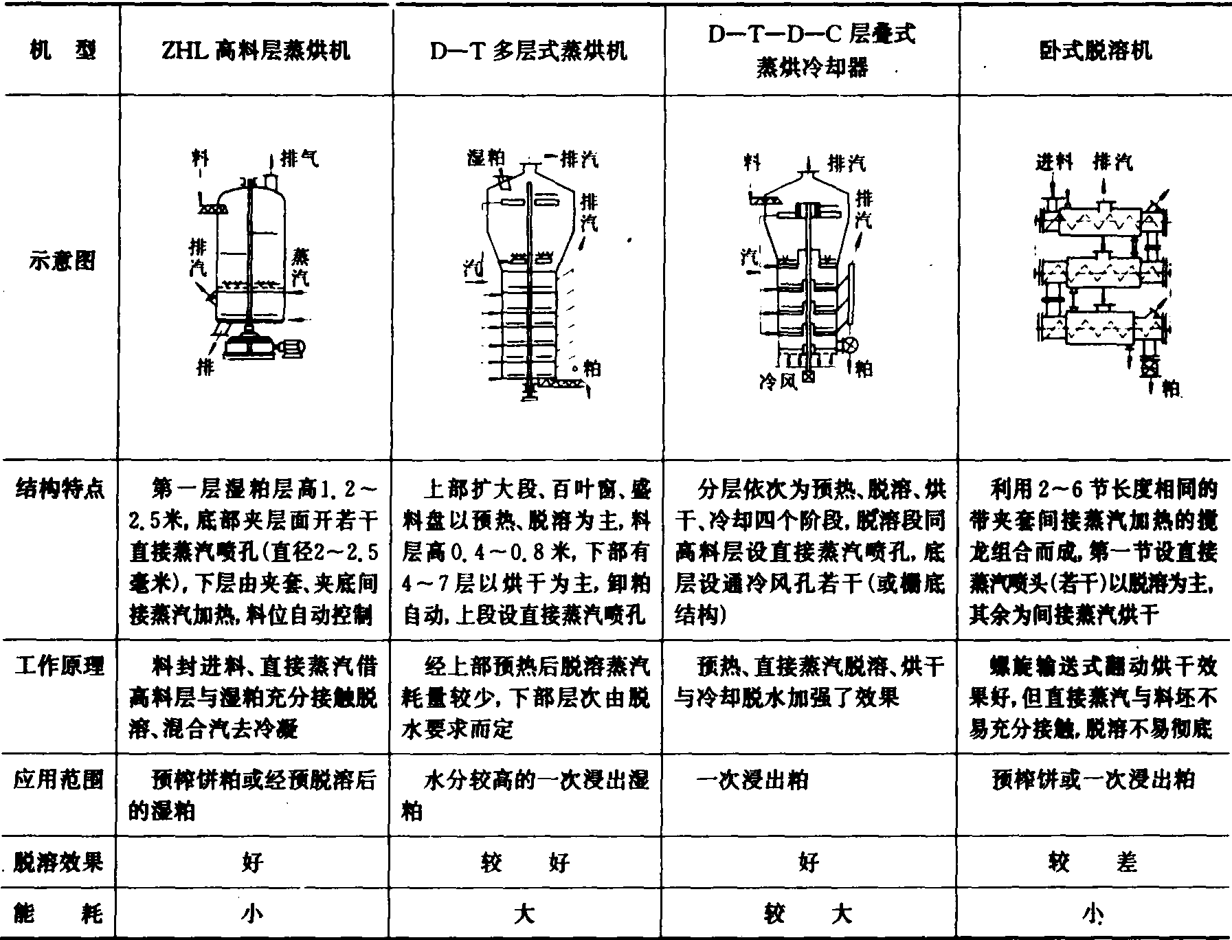 图3 平转型浸出器 1.循环泵; 2.传动装置; 3.混合油; 4.溶剂; 5.大喷淋机构; 6.尾气; 7.旋液分离器; 8.浓混合油; 9.料坯; 10.料坯输送器; 11.喷头; 12.回转筒; 13.链齿;14.扇形假底; 15.出粕输送器; 16.湿粕; 17.集油斗;18.沥干段; 19.卸粕 平转浸出器的结构型式按假底卸粕程序分为前开门与后开门两种。前者可有效利用设备空间,适合于大中型规模;后者能自动卸粕和关闭假底,因而结构简单、使用方便。新出现的一种单层或双层组合式固定栅底结构的新型平转浸出器,能克服假底易磨损、筛网更换困难以及冲击式卸粕等弊端。 平转浸出器具有结构紧凑; 运行可靠、泄漏少;混合油清净而浓度较高; 采用大喷淋浸泡与渗滤相结合, 浸出效果好; 料层高而设备处理能力幅度大(20~3 000吨/日), 且可适应多品种油料等特点。但对于粉末度大的油料则不很适应, 且设备本身庞大、运输不便。 水平篮框式浸出器 在履带式基础上改进而成的带框格浸出器。即在水平移动连续开孔的运输带上装有若干(42~62个)活动隔板形成“篮框”,这样可避免履带式易混流、混合油浓度差不明显的弊病;且渗透性好,浸出料层浅(0.5米左右),料坯在中途翻转掉入下部框格内继续浸出,提高了浸出器的利用率,同时也避免了结块而提高了浸出效率。该浸出器能适用于米糠、玉米胚芽、菜籽饼等粉末多的油料。 固定篮框式浸出器 与平转型的浸出过程基本相同,但扇形浸出格固定不动,在完成逆流浸出全过程中,新鲜溶剂和混合油喷淋装置、进料管以及出粕口全部是转动部件。其特点是转动部件轻、料床稳定、混合油洁净、维护简单等。但形体高大、结构复杂,不适应于粉末状油料浸出。 浸出器的类型较多,在选择使用时,应以原料结构性质、生产规模、浸出方式、浸出级数(喷淋次数)和工艺条件(浸出时间、温度、溶剂比)等作为主要依据。四种主要机型的性能对比见表1。 浸出配套设备 包括:脱溶烤粕、混合油分离、尾气溶剂回收装置以及废水中溶剂回收装置等部分,须按工艺要求组合配套。 脱溶烤粕设备 将浸出后的含溶湿粕用直接蒸汽汽提原理脱除残留溶剂,接着用间接蒸汽加热去水烘干达安全水分以下的组合设备。几种常用设备的结构特点、工作原理及用途见表2。 表1 四种浸出器性能对比