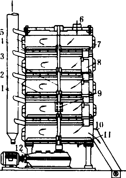 立式蒸炒锅结构示意图 1.排气管; 2.搅拌叶; 3.搅拌轴;4.底夹层; 5.边夹层; 6.进料口;7.落料孔; 8.自动落料门; 9.联轴器;10.出料口; 11.进气管; 12.变速箱 坯料从上部进入蒸炒锅,在第一、二层由润湿装置加入水分使之湿润,并通过间接蒸汽在100℃左右的温度下进行蒸坯。然后坯料落入下层,逐渐过渡到炒坯,以使坯料达到入榨前所需要的温度和水分。 立式蒸炒锅的内径为1000~2100毫米。搅拌器的转速为30~40转/分,配用动力5.5~22千瓦。总加热面积为10~25米2,生产能力为10~50吨/日。 卧式蒸炒锅 由卧式长方形的双层圆筒和搅拌器组成的蒸炒设备。一般直接装在螺旋榨油机上使用。上层圆筒装有蒸汽夹套, 主要起蒸炒作用; 下层圆筒直径较小, 可通入蒸汽进行温度和水分调节, 搅拌器装在圆筒内, 由搅拌轴和螺旋形桨叶组成。坯料从上层圆筒的一端进入, 在搅拌器的作用下向前推进, 至另一端落入下层圆筒, 然后进入榨油机。这种蒸炒锅结构简单, 但存料少, 蒸炒时间短, 坯料翻动剧烈,加热不均匀。 转筒式炒锅 由卧式圆筒构成的炒籽设备。其结构和工作原理类似于转筒式烘干机(见谷物干燥设备)。滚筒由间接蒸汽或热空气加热。油料从滚筒的一端进入,在随滚筒翻滚的同时被加热蒸炒,最后从另一端排出。 平底炒锅 一种圆形容器式的平底炒坯设备。中间装有搅拌轴和叶片,侧面装有出料口。坯料从上部进人炒锅,由锅底下面的火直接加热,炒完后打开出料口排料。这种炒锅适于烘炒米糠、茶籽和棉籽等油料。炒锅直径一般为1 300毫米左右,深约550毫米。主轴转速为50~70转/分,配备动力1千瓦。炒坯能力达300~600千克/小时。 蒸坯甑 由普通铁锅和木制甑桶组成。适用于农村榨坊。桶底部有孔,装入坯料后放置铁锅内。铁锅盛水,锅底用火直接加热,以产生蒸汽,进行蒸坯。 油料蒸炒设备equipment for oil steaming将轧坯后的生料坯加水湿润、加热蒸坯、干燥炒坯,使之成为熟坯油料的设备。使用最广的是圆柱立式蒸炒锅。主要由多层叠置的圆柱形锅体、蒸气夹层、喷水管、喷气管、搅拌器、落料口与自动料门、动力和传动装置等组成。生料自顶部喂料口进入锅内,由夹层蒸气加热蒸炒,依次进入各层连续蒸炒,最后由下锅体出料口排出。落料孔的开闭是靠自动料门控制,当锅内存料量少时,料门敞开下料;当存料量达到规定限度时,料门自动关闭。 |